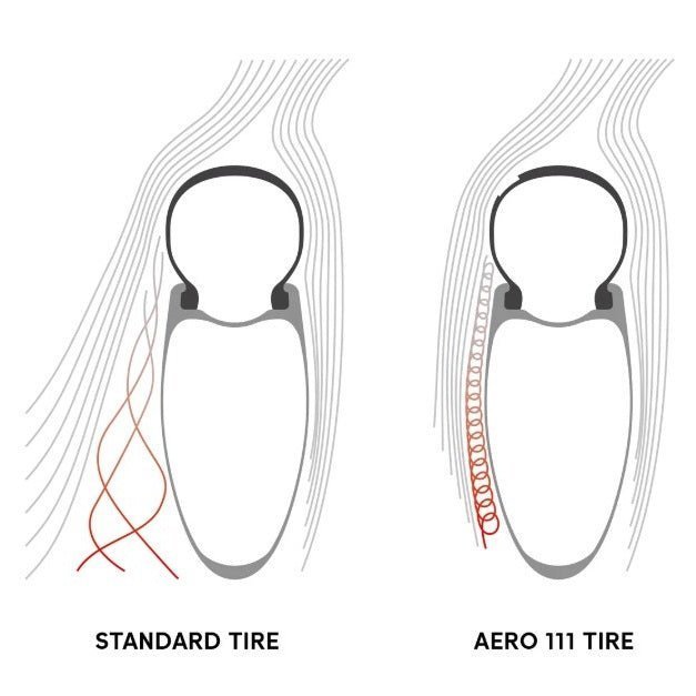►Technologie WTS : la roue et le pneu ont été considéré comme un seul ensemble : le Wheel Tire System. Le modèle AERO 111, spécifique avant est parfaitement adapté à la jante Aero et affichant une optimisation aérodynamique sans précédent. La surface comprend 48 cavités régulièrement réparties sur son ensemble, appelées générateurs de vortex. Ces derniers permettent de contrôler les perturbations du flux d’air sur la roue avant; et ainsi de réduire efficacement la traînée de l’ensemble.