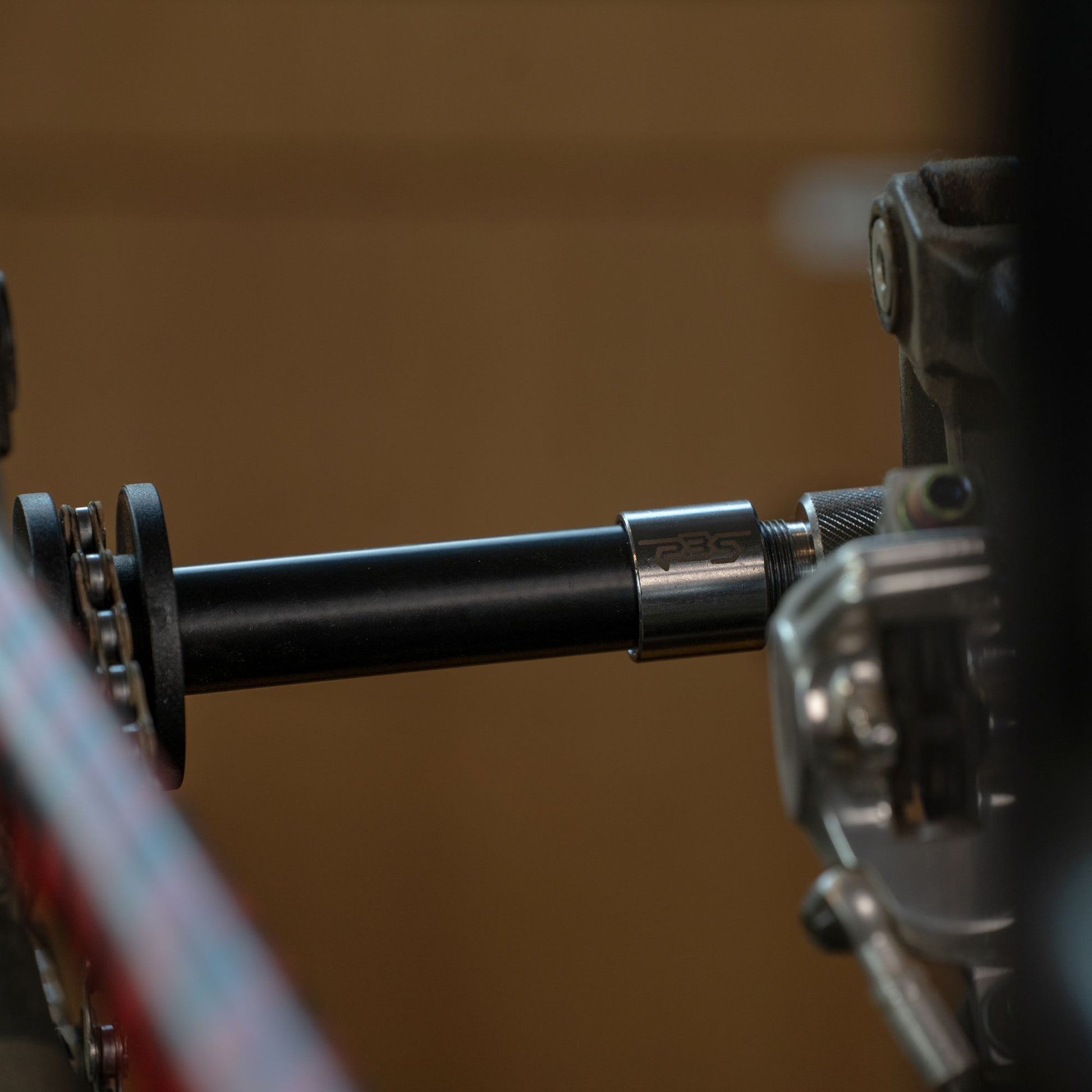 The PBS TOOLS chain holder maintains chain tension when the rear wheel is removed. It prevents chain tangling and protects the frame when transporting the bike without a wheel.