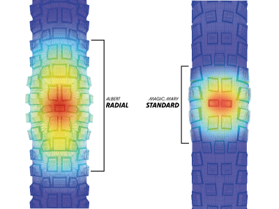 Schwalbe has rethought the structure of mountain bike tires: instead of the classic diagonal weave, the threads are placed at a distance of one from the other. obtuse angle allowing the tire to deform more punctually. As a result, the tire follows irregularities much better than a diagonal-ply tire, and always maintains contact with the ground. The result: more grip, more comfort and more safety in the field. What's more, for the same pressure, the contact area increases by around 30%.