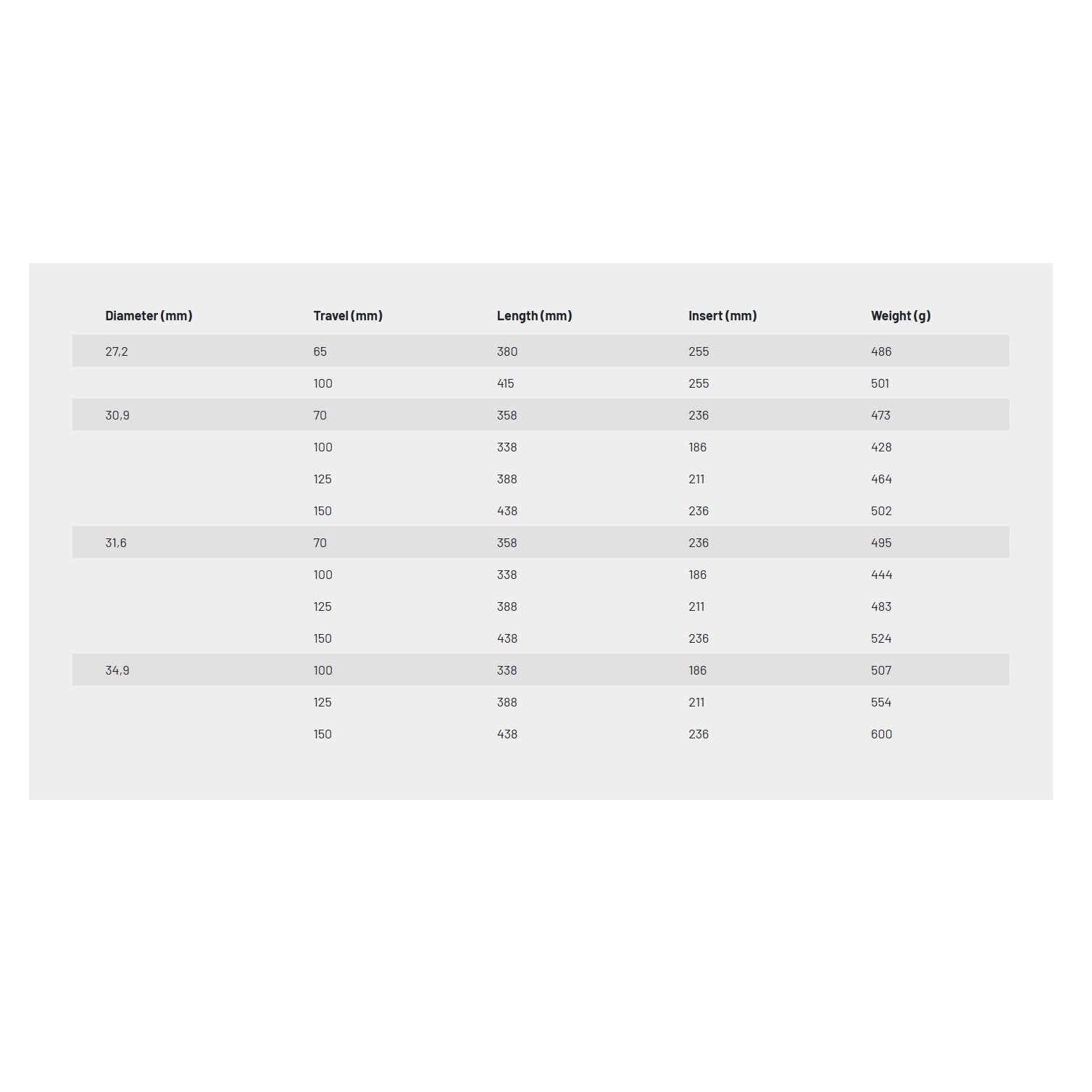 - 31.6 > 70/358/495g - 100/338/444g - 125/388/483g - 150/438/524g