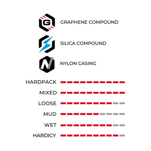 Martello is a versatile tire that adapts to all conditions. The stud profile provides perfect grip without compromising speed, for fast, technical riding. All this is combined with Graphene 2.0 compound for even more reliable grip, and outstanding behavior on wet surfaces.