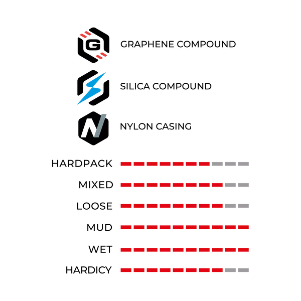 The Mota is a stable tire that adapts to a wide range of conditions. The stud profile provides perfect grip without compromising speed, for fast, technical riding.