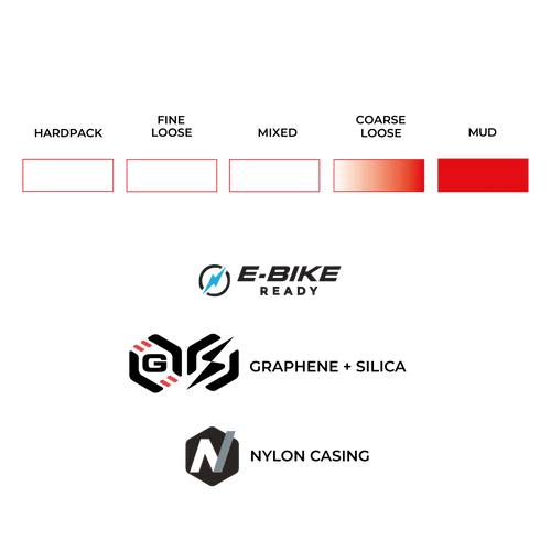 Chaque crampon possède un motif progressif de lamelles pour mordre dans les racines et les rochers cachés, garantissant maniabilité et rebond réactif, même sur les sentiers les plus imprévisibles. La Race Formulation Graphene + Silica équilibre vitesse, adhérence et durabilité, tandis que la carcasse Race en nylon 60 TPI protège contre les crevaisons et contrôle la déformation du pneu.