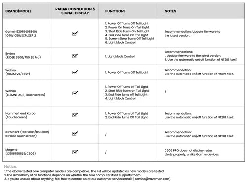 RAVEMEN NT201 bakljus är kompatibelt med Garmin-, Wahoo- och Hammerhead-datorer och passar perfekt in i den uppkopplade cyklistens ekosystem. Trafikinformation visas tydligt och direkt, vilket gör det möjligt att förutse den bakre miljön och anpassa körningen därefter.