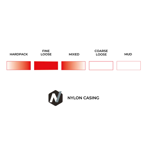 Sa bande de roulement centrale en écailles de poisson réduit la résistance au roulement tout en garantissant traction et stabilité au freinage. Les crampons d’épaule rainurés assurent une accroche optimale dans les virages et sur les sections en dévers, tandis que le profil à transition progressive offre une conduite fluide et confiante, même à haute vitesse.